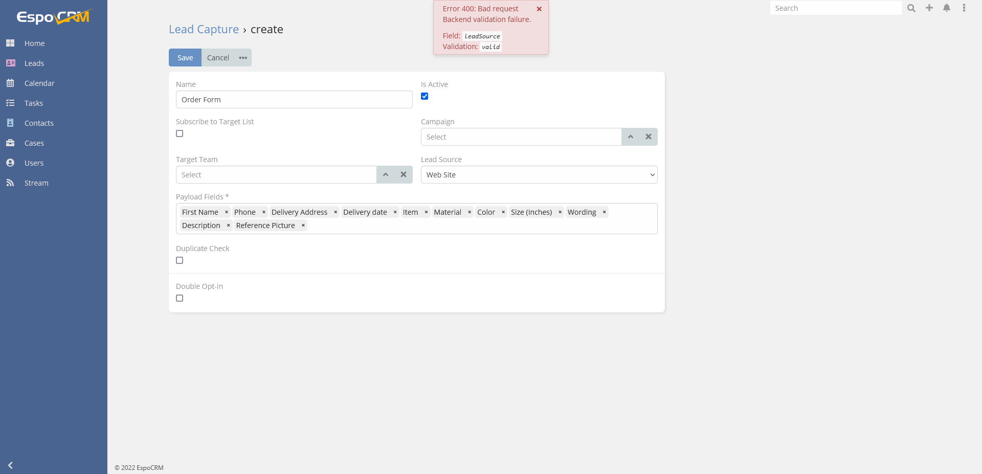 I get the below error when trying to create a new web lead capture form