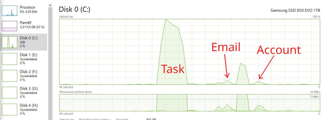I find that there is very high disk load when opening a task. We have only about 200 tasks. And we have about 120000 emails and about 2000 accounts and there are not problems, see picture.