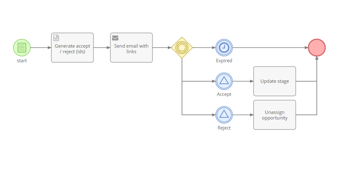 Is it possible to implement a scenario using BPM in which, after creating Opportunity, an e-mail is sent to the assigned person with an acceptance and rejection link? After clicking in mail, the status of the Sales Opportunity changes.