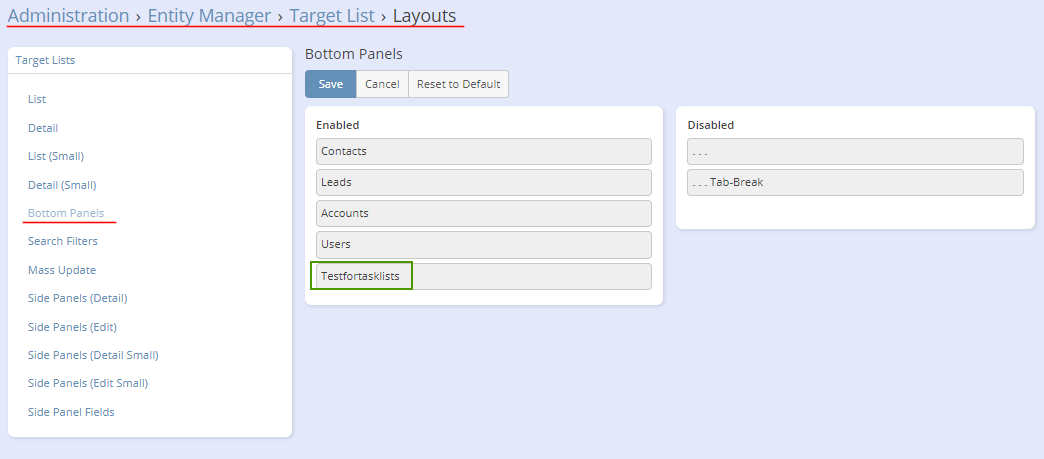 - Go in Administration > Entity Manager > Target List > Layouts > Bottom Panels and add your entity with Person type (screenshot 5).