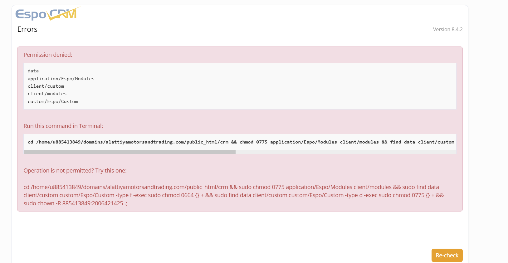 2- Find the permissions.php contents. Can be found in3- Replace all the code inside permissions.php by the following code that can be found in:Code:application/Espo/Core/Utils/File/permissions.php