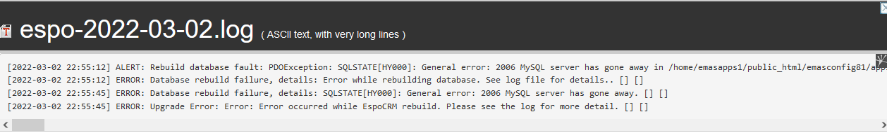 [2022-03-01 22:35:27] ALERT: Rebuild database fault: PDOException: SQLSTATE[HY000]: General error: 2006 MySQL server has gone away in /home/emasapps1/public_html/emasconfig/application/Espo/ORM/SqlExecutor.php:70 Stack trace: #0 /home/emasapps1/public_html/emasconfig/application/Espo/ORM/SqlExecutor.php(70): PDO->query('SELECT user.id ...') #1 /home/emasapps1/public_html/emasconfig/application/Espo/ORM/SqlExecutor.php(59): Espo\ORM\SqlExecutor->executeSqlWithDeadlockHandling('SELECT user.id ...', 1) #2 /home/emasapps1/public_html/emasconfig/application/Espo/ORM/Mapper/BaseMapper.php(737): Espo\ORM\SqlExecutor->execute('SELECT user.id ...', false) #3 /home/emasapps1/public_html/emasconfig/application/Espo/ORM/Mapper/BaseMapper.php(128): Espo\ORM\Mapper\BaseMapper->executeSql('SELECT user.id ...') #4 /home/emasapps1/public_html/emasconfig/application/Espo/ORM/Repository/RDBRepository.php(130): Espo\ORM\Mapper\BaseMapper->selectOne(Object(Espo\ORM\Query\Select)) #5 /home/emasapps1/public_html/emasconfig/application/Espo/ORM/EntityManager.php(272): Espo\ORM\Repository\RDBRepository->getById('system') #6 /home/emasapps1/public_html/emasconfig/application/Espo/Core/Utils/Database/Schema/rebuildActions/AddSystemUser.php(40): Espo\ORM\EntityManager->getEntity('User', 'system') #7 /home/emasapps1/public_html/emasconfig/application/Espo/Core/Utils/Database/Schema/Schema.php(339): Espo\Core\Utils\Database\Schema\rebuildActions\Add SystemUser->afterRebuild() #8 /home/emasapps1/public_html/emasconfig/application/Espo/Core/Utils/Database/Schema/Schema.php(243): Espo\Core\Utils\Database\Schema\Schema->executeRebuildActions('afterRebuild') #9 /home/emasapps1/public_html/emasconfig/application/Espo/Core/Utils/Database/Schema/SchemaProxy.php(53): Espo\Core\Utils\Database\Schema\Schema->rebuild() #10 /home/emasapps1/public_html/emasconfig/application/Espo/Core/DataManager.php(146): Espo\Core\Utils\Database\Schema\SchemaProxy->rebuild(NULL) #11 /home/emasapps1/public_html/emasconfig/application/Espo/Core/DataManager.php(115): Espo\Core\DataManager->rebuildDatabase(NULL) #12 /home/emasapps1/public_html/emasconfig/application/Espo/Core/Upgrades/Actions/Base.php(807): Espo\Core\DataManager->rebuild() #13 /home/emasapps1/public_html/emasconfig/application/Espo/Core/Upgrades/Actions/Base/Install.php(181): Espo\Core\Upgrades\Actions\Base->systemRebuild() #14 /home/emasapps1/public_html/emasconfig/application/Espo/Core/Upgrades/Base.php(129): Espo\Core\Upgrades\Actions\Base\Install->stepRebuild(Array) #15 /home/emasapps1/public_html/emasconfig/application/Espo/Core/Upgrades/Base.php(112): Espo\Core\Upgrades\Base->runActionStep('install', 'Rebuild', Array) #16 /home/emasapps1/public_html/emasconfig/application/Espo/Core/Console/Commands/UpgradeStep.php(96): Espo\Core\Upgrades\Base->runInstallStep('Rebuild', Array) #17 /home/emasapps1/public_html/emasconfig/application/Espo/Core/Console/Commands/UpgradeStep.php(76): Espo\Core\Console\Commands\UpgradeStep->runUpgradeStep('Rebuild', Array) #18 /home/emasapps1/public_html/emasconfig/application/Espo/Core/Console/CommandManager.php(90): Espo\Core\Console\Commands\UpgradeStep->run(Object(Espo\Core\Console\Command\Params), Object(Espo\Core\Console\IO)) #19 /home/emasapps1/public_html/emasconfig/application/Espo/Core/ApplicationRunners/Command.php(55): Espo\Core\Console\CommandManager->run(Array) #20 /home/emasapps1/public_html/emasconfig/application/Espo/Core/Application/RunnerRunner.php(85): Espo\Core\ApplicationRunners\Command->run() #21 /home/emasapps1/public_html/emasconfig/application/Espo/Core/Application.php(78): Espo\Core\Application\RunnerRunner->run('Espo\\Core\\Appli...', NULL) #22 /home/emasapps1/public_html/emasconfig/command.php(35): Espo\Core\Application->run('Espo\\Core\\Appli...') #23 {main} [] []