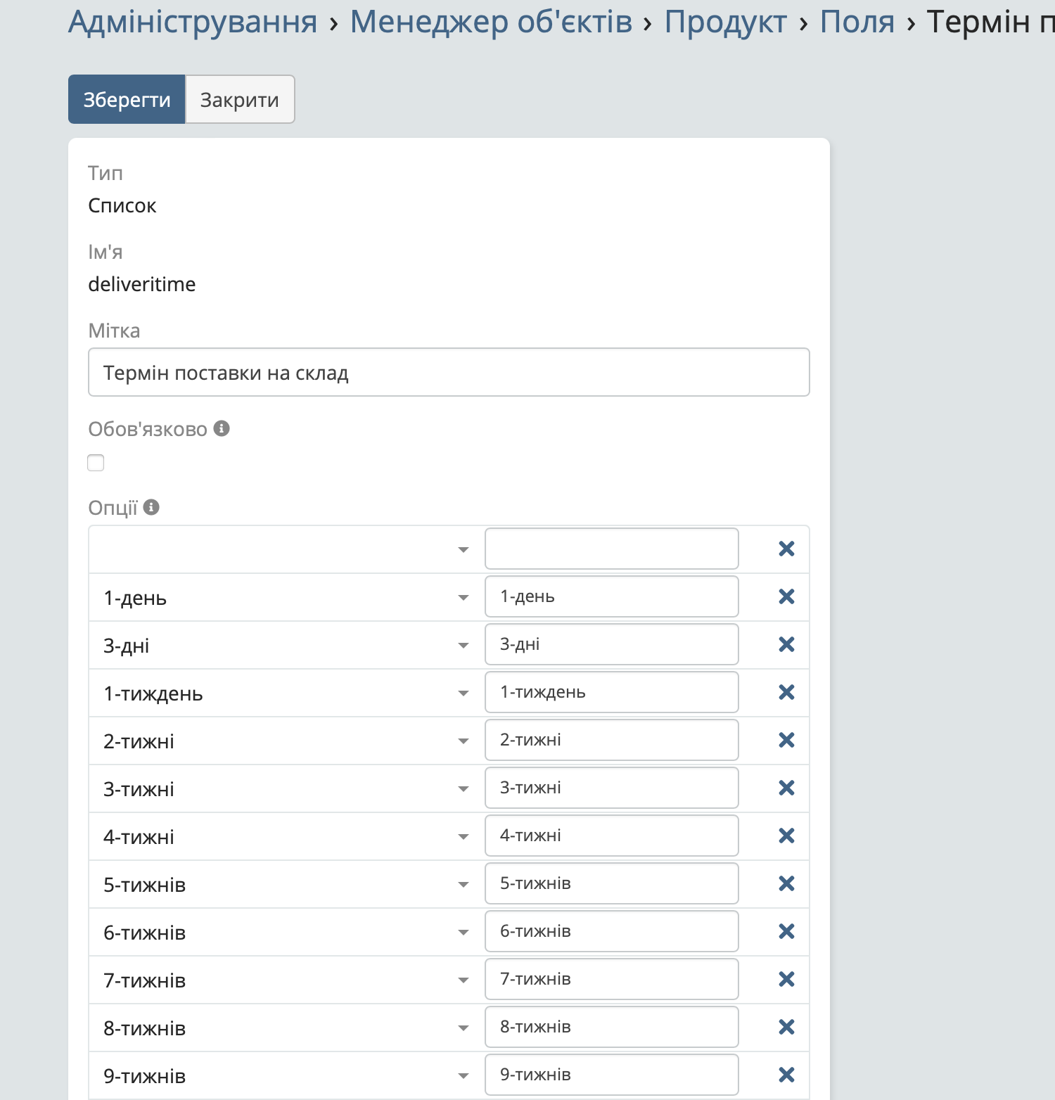 Створив (Термін поставки на склад) з типом (Масив) і все працює, єдине що потрібно в ручну перенабрати в кожному продукті